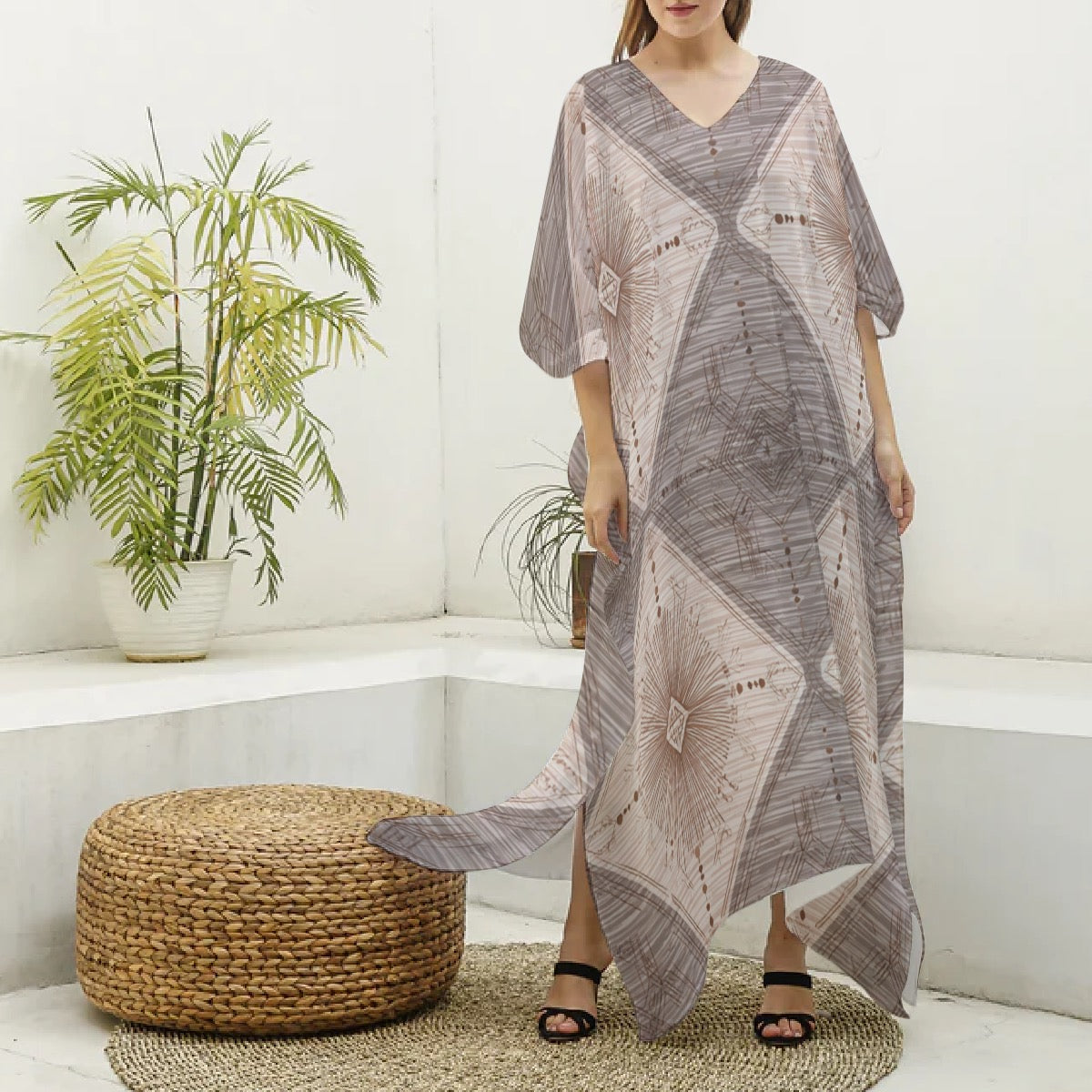 Savanna Whisper Flow Moo Moo – Abstract Earth-Tone Kaftan Dress Imitation Silk V-neck Kaftan Robe