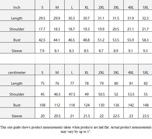 inch | S | M | L | XL | 2XL | 3XL | 4XL | 5XL |