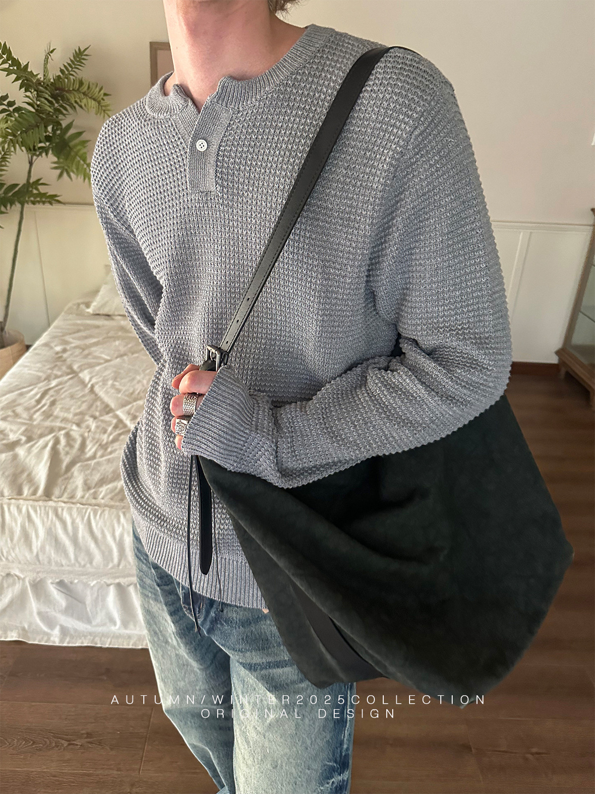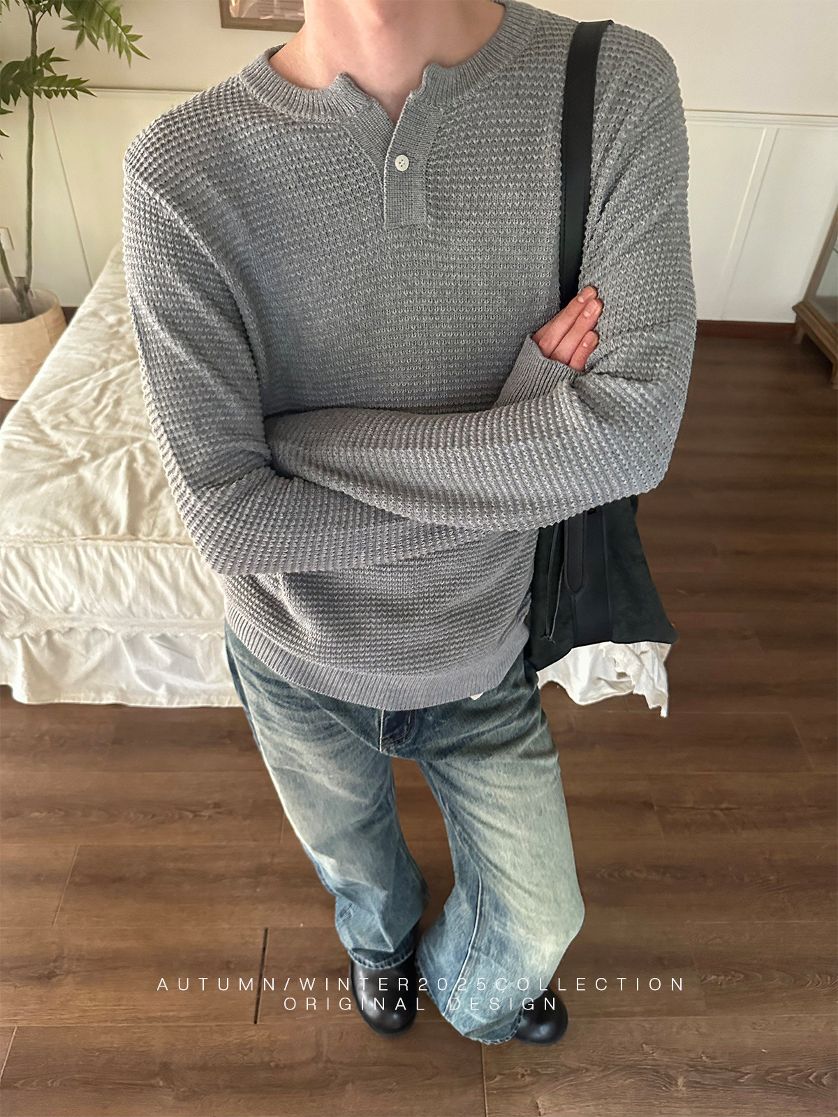 Unisex V-Neck Long Sleeve Cotton Sweater – Loose Fit Henley Collar Knit Top for Men and Women | Small V-Neck Long Sleeve T-Shirt for Men and Women Loose Fit Henry Collar Sweater
